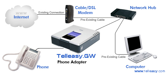 Telleasy.GW利用业界领先的融合通讯科技将宽带互联网变成电话线,变复杂为简单化,您不必使用电脑、安装软件、耳机、话筒,只需简单的将我们提供的GW设备使用RJ-45网线通过ADSL/cable modem 等上网设备连接到互联网,并将您现有的普通电话机使用RJ-11电话线连接到GW设备上,就可以开始打电话。 就这么简单!不需要工程师进行复杂的安装设置,下图就是详细说明。 |